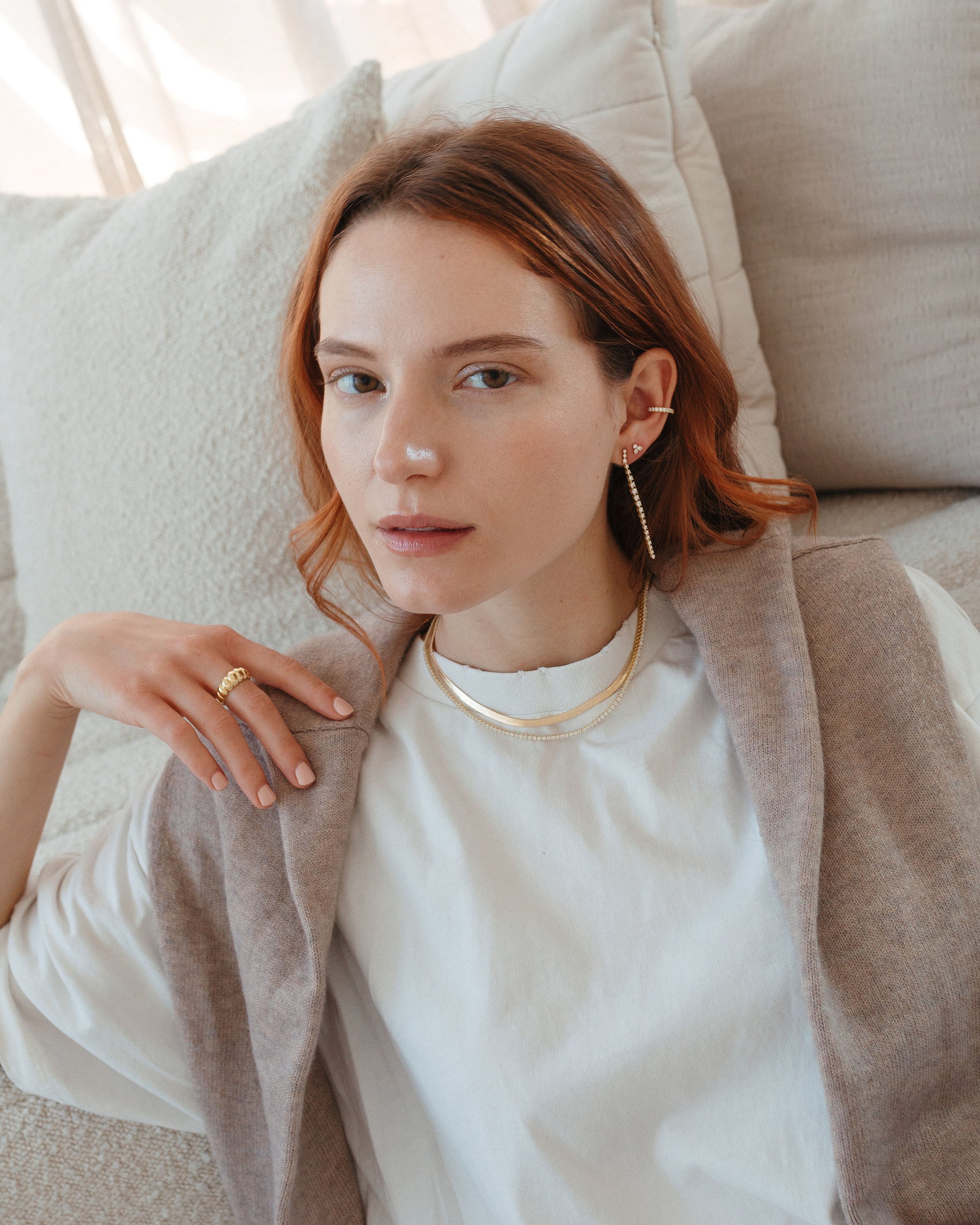 Create a perfectly curated ear stack with a delicate mix of tiny studs, huggie hoops, and dainty chains for an effortlessly balanced and stylish look. ✨