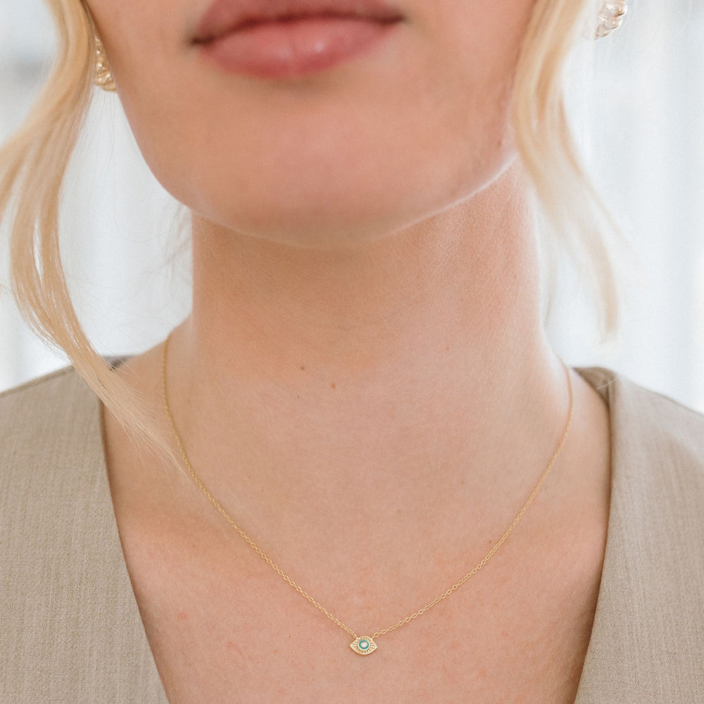 A tiny evil eye charm hangs along a dainty chain. Wear it layered or solo! So cute and tiny you can wear it everyday! Make this your lucky charm.