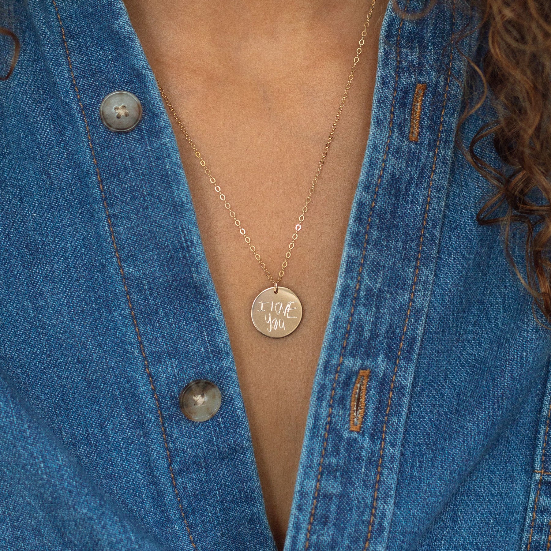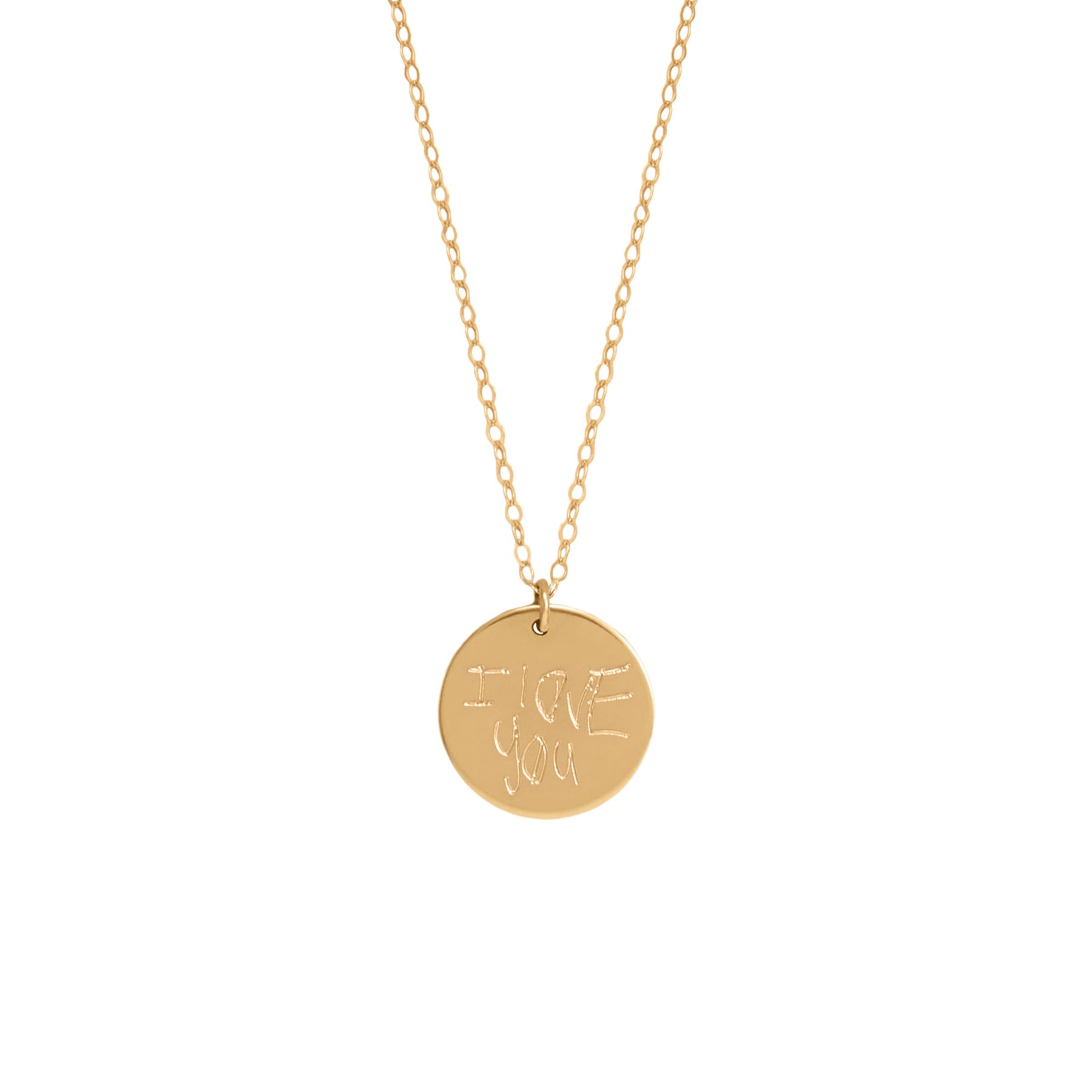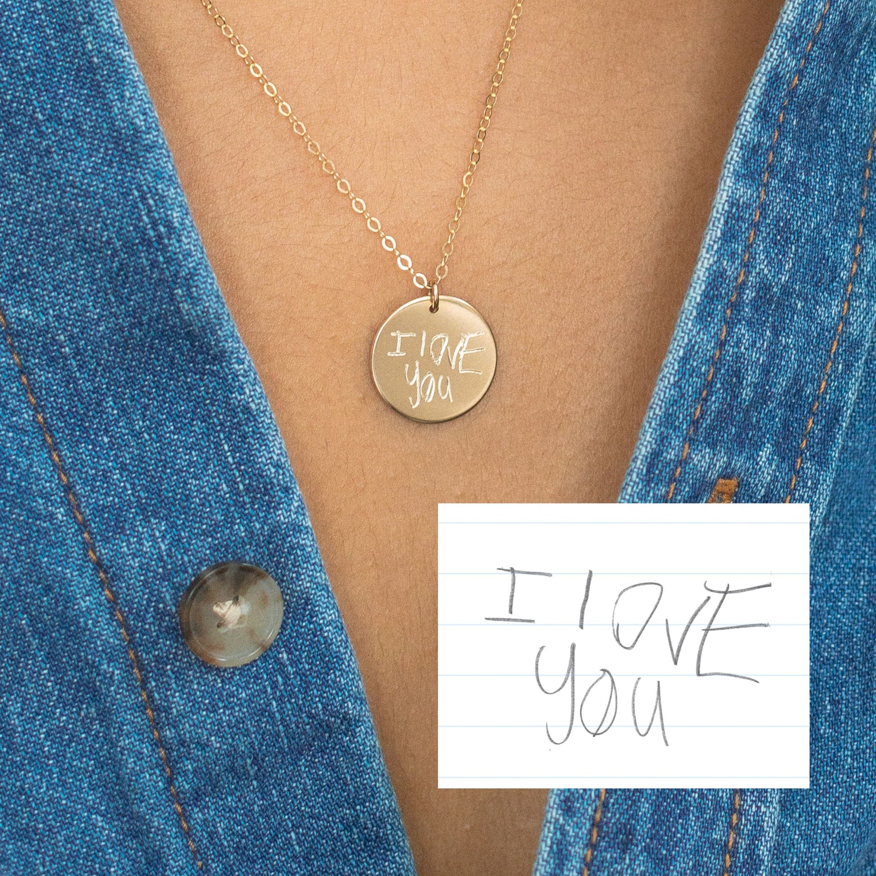 Keep the words that mean the most close to your heart. Our Handwriting Necklace lets you turn a handwritten note, signature, or special doodle into a one-of-a-kind keepsake. Whether it’s a loved one’s message, a child’s drawing, or a few meaningful words, we’ll carefully engrave your design on a beautiful round disc or rectangular pendant to create something truly special.