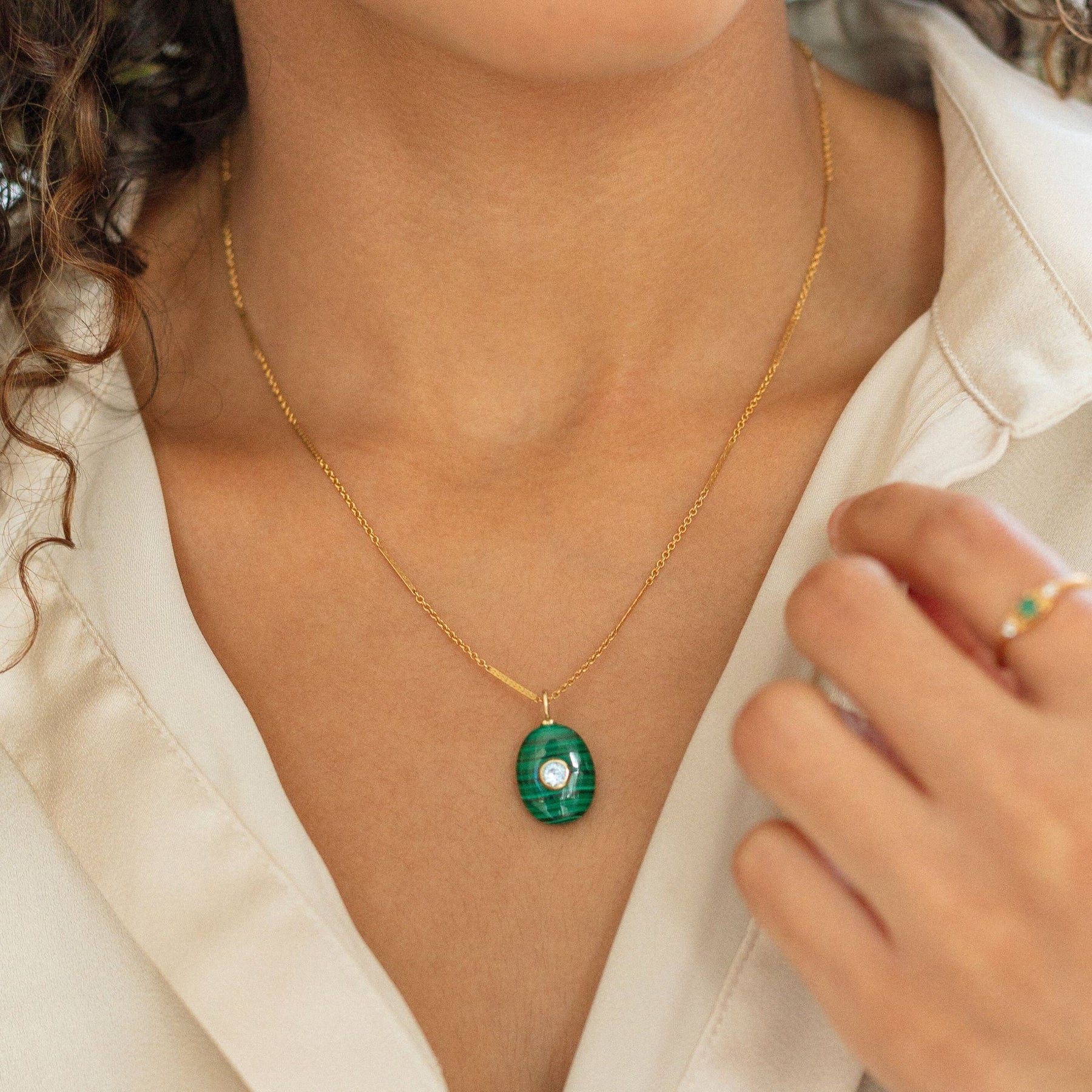 Rich with striking green striations, this malachite charm symbolizes transformation and protection, elevated with a blue topaz inlay for truth and insight. 17 x 13 mm