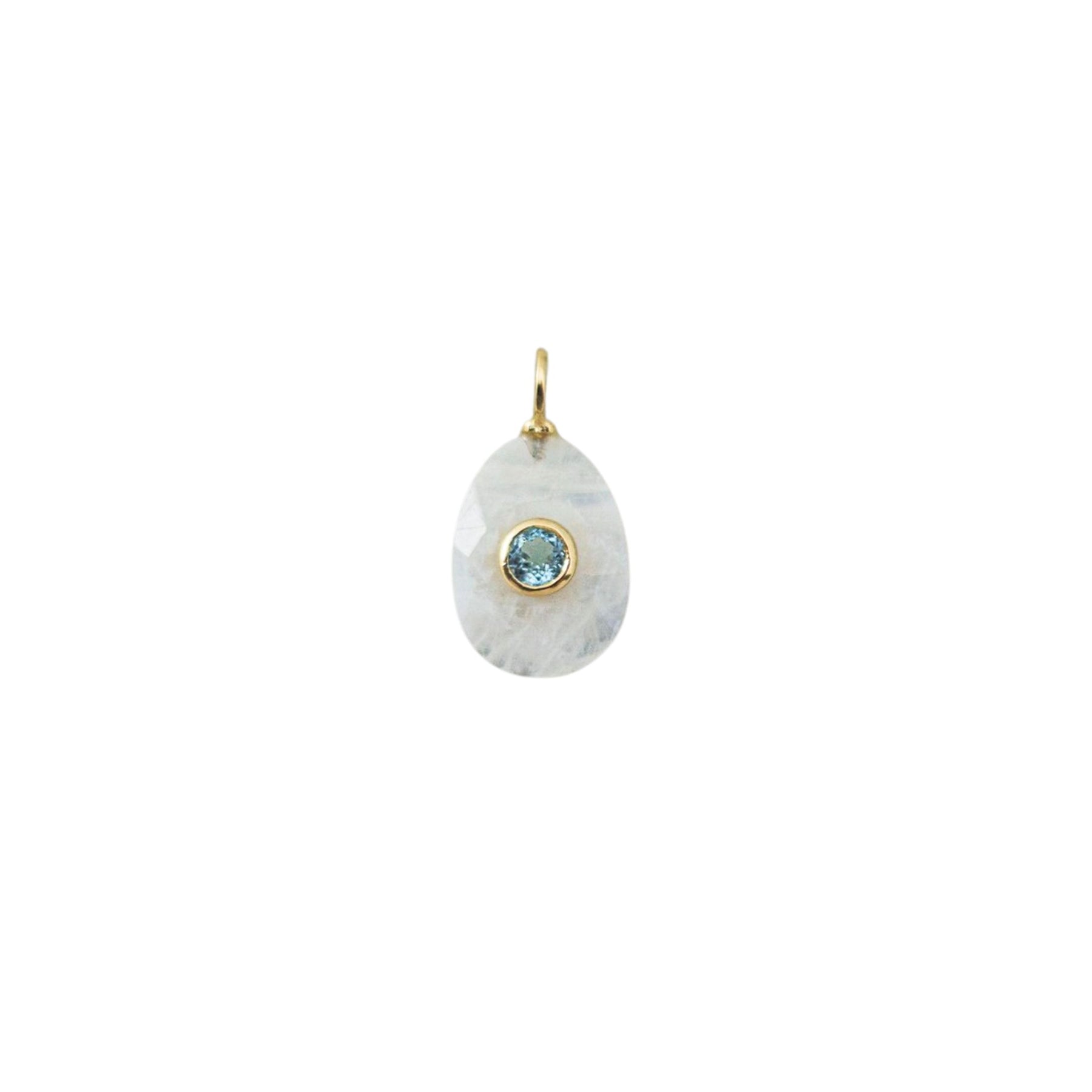 Shimmering with light and feminine energy, this faceted rainbow moonstone glows with iridescence and is topped with a blue topaz inlay for extra sparkle. 17 x 13 mm