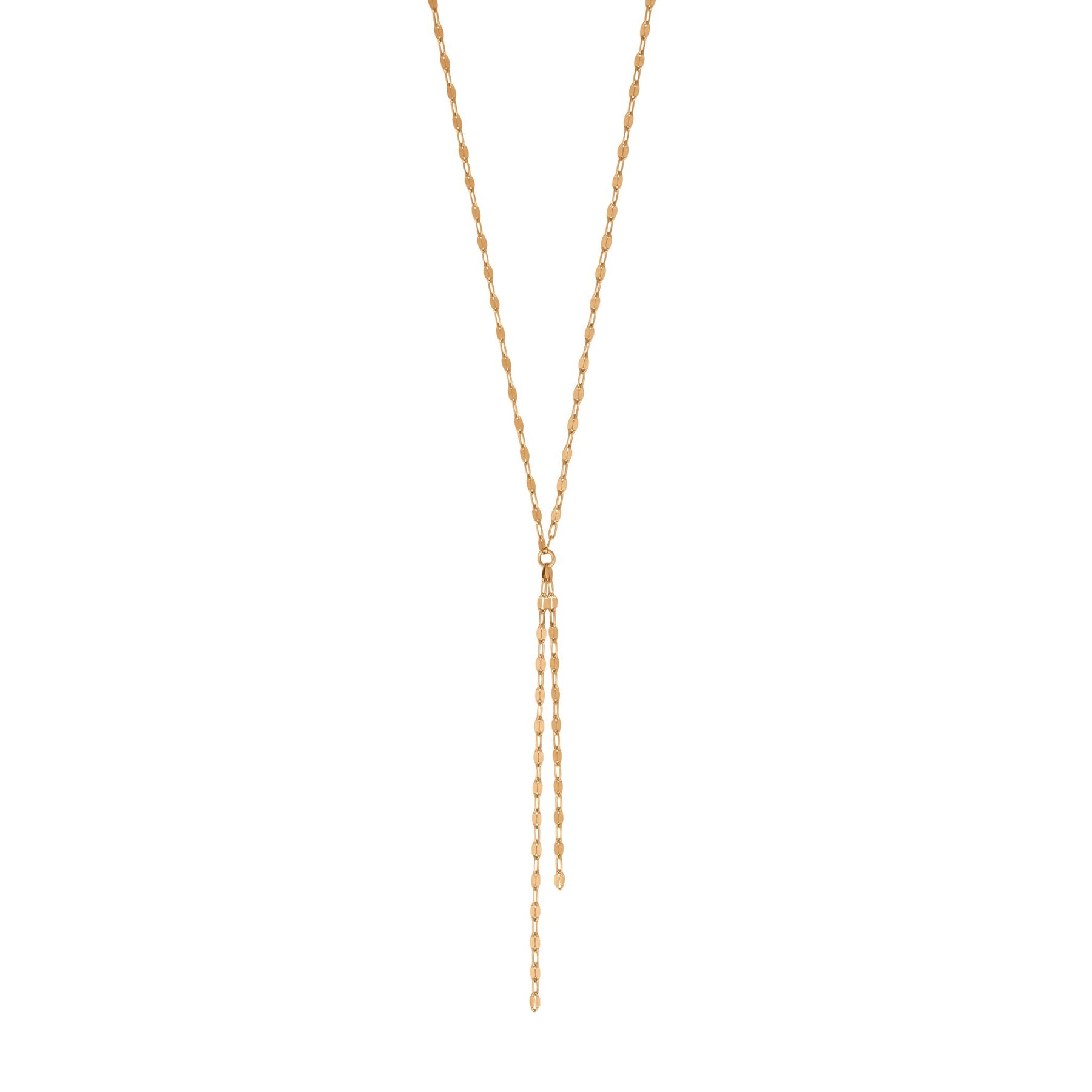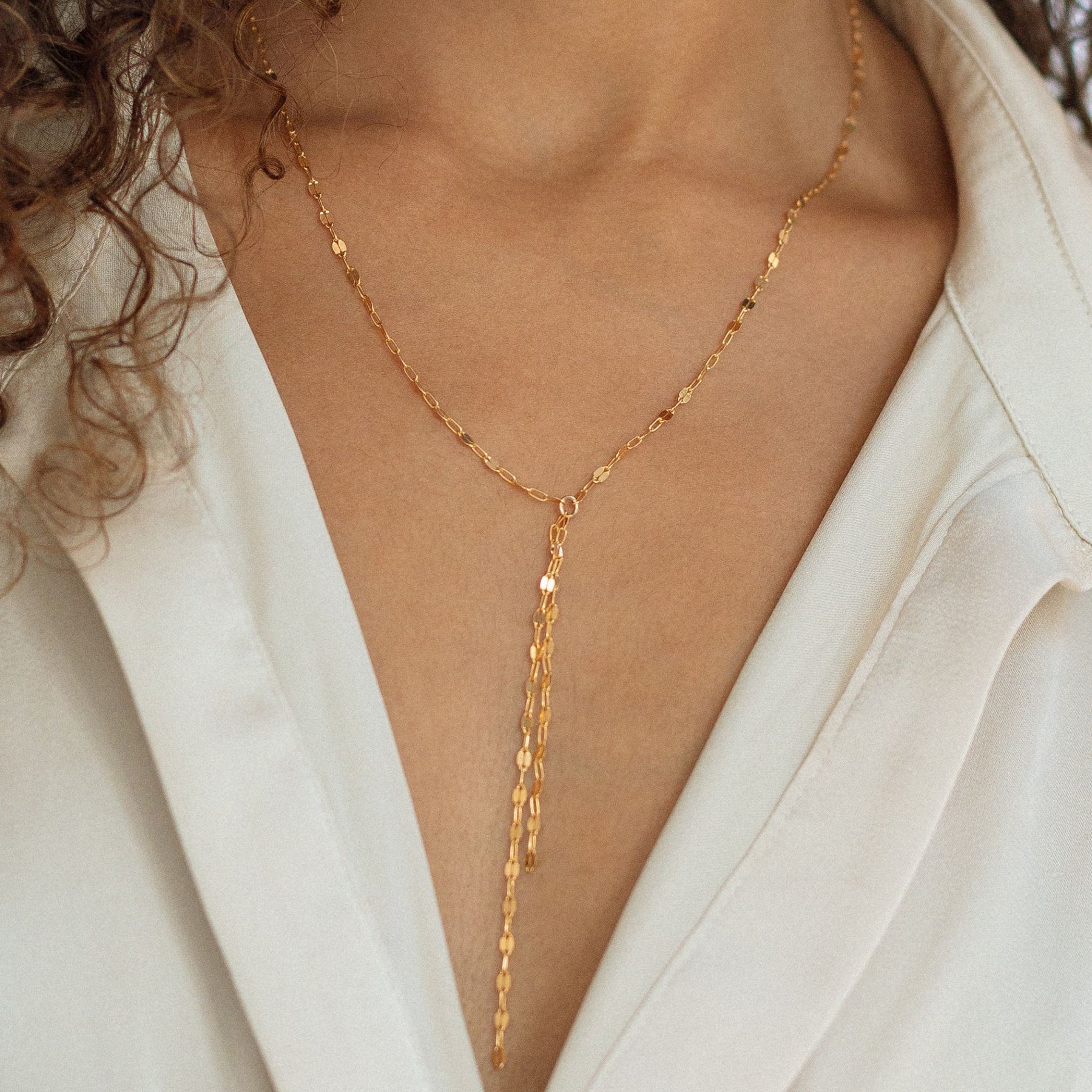 Our Gold Mirror Chain Lariat Necklace is a sleek, modern take on the classic lariat. The mirrored finish catches the light beautifully, while the double drop (4" & 2.5") adds the perfect touch of movement. Designed to hang long, it pairs effortlessly with a V-neck top or layered with your favorite chains for a statement look. This one truly goes with everything.